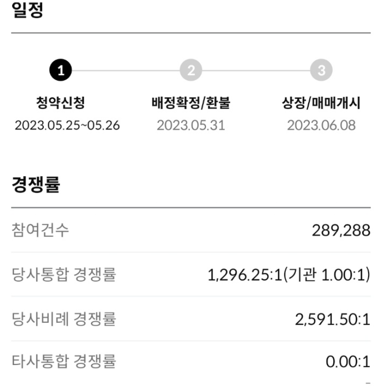 상장 당일 비례 경쟁률만 해도 치열하다는 것을 확인할 수 있었습니다.
